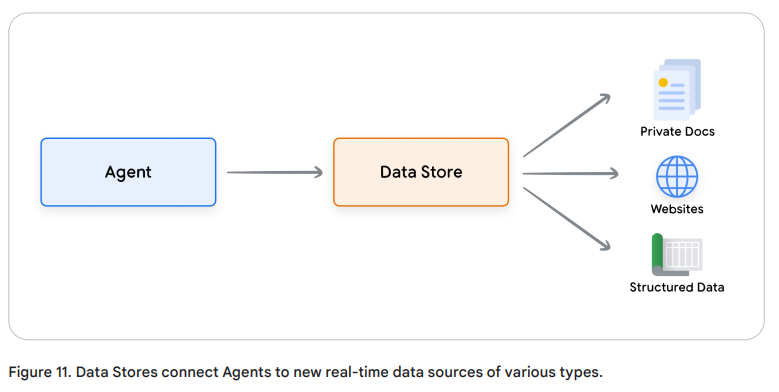 - Data Store: 외부 문서, 데이터베이스 등에서 정보를 찾아주는 벡터 검색 기반 저장소 (RAG)